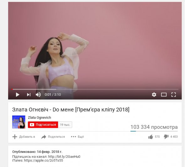 Нове відео української співачки Злати Огнєвіч на пісню "Do мене", яке виклали в YouTube у День всіх закоханих (14 лютого), за кілька годин набрало понад 4 тис. дізлайків.