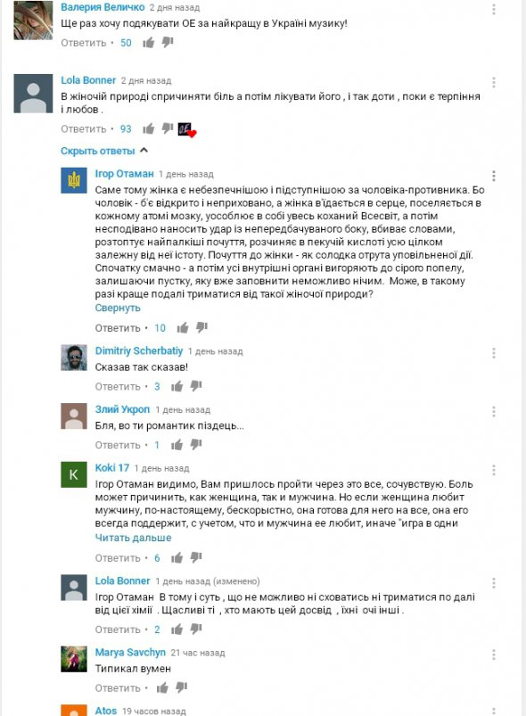 Вікторія Уханева написала: "Кліп про те, як близькі люди можуть робити одне одному боляче, причому напоказ, і не завжди той, хто переміг - у виграші Зависла в голові ця пісня, тиждень її співаю, ОЕ, я від вас залежна і це не вилікувати".