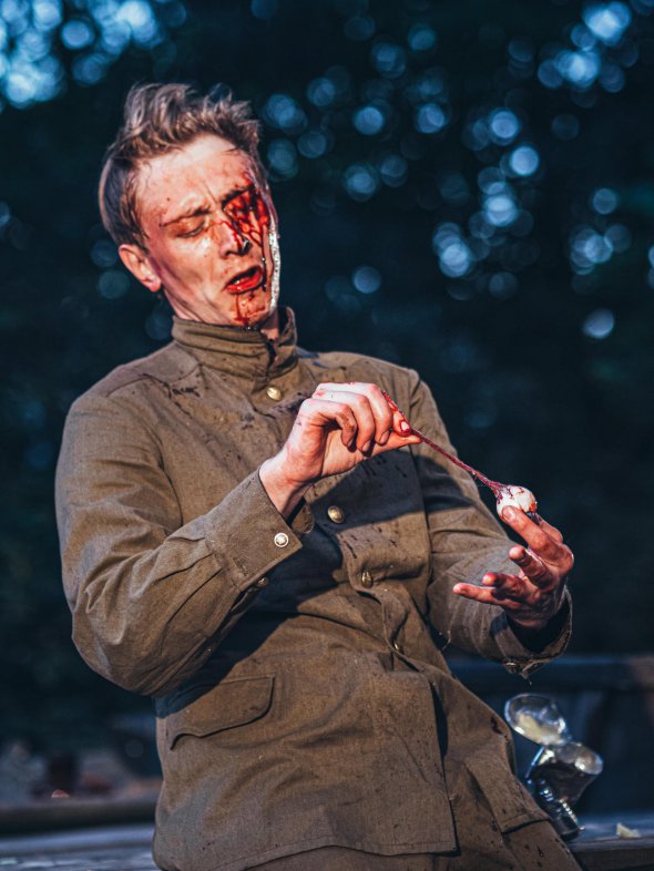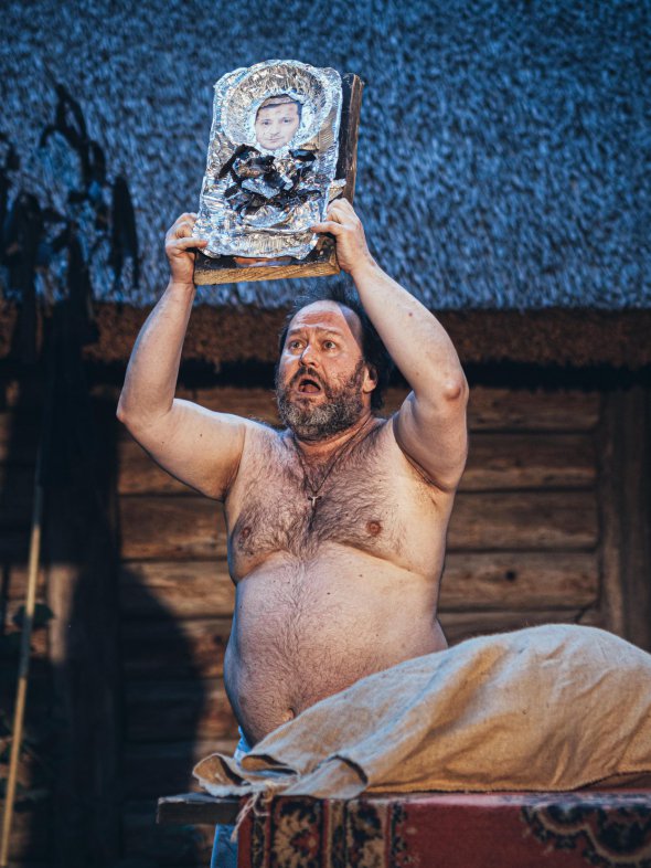 "Самий концепт нашої п'єси антивоєнний, але показуємо криваві сцени, абсурд, гротеск, який, між іншим, не є вигаданим, - розповідає Олександр Набока. - 1919-1920 років, коли Україна буквально перетворилася на Дикий Захід, таке цілком могло бути. На сцену з головою Дашева наштовхнули архівні фото тих років. На них – радянський активіст, якому відрубали голову прибічники відомого в наших краях повстанця на прізвище Каменюка. "Звєрство банди Камєнюки", - так колись підписали світлину.