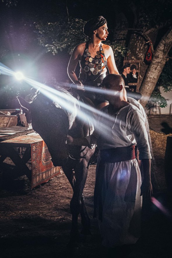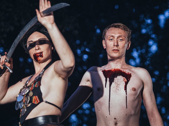"У той момент я уособлювала смерть, яка вибирає, кого треба лишити, - розповідає виконавиця ролі Катерини Наталя Кобізька. Неподалік клуні гример вимащує її штучною кров'ю. - За сценарієм у мене було лише кілька сцен. У п'єсі Катька – солдатка і така собі дівчина-втіха для місцевих і заїжджих в село військових. Але Максим Голенко дозволяє акторам бути співавторами ролі – і ми разом вирішили поекспериментувати, зробили Катю глибшою, ніж просто повія. Вирішили, що Катерина має вершити долі чоловіків. У нас вона – наскрізь алегоричний образ - уособлення землі, війни, анархії надприродної відьомської сили і навіть смерті. У якийсь момент Катерина показує, що вона слабка – "приходь, утішся, все буде добре", але якщо щось не по її – то в буквальному сенсі летять голови".