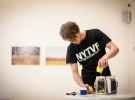 - До прикладу, проект Юрія Білея. Оскільки він працює в жанрі перформенсу, то його роботи мають більш інтерактивний характер. Це ряд прозорих банок, заповнених фарбою. Вони перевернуті на стопку білих серветок. Поки що мають гарний вигляд, але проект змінюватиметься. Зараз це нагадує веселку. З часом серветки поглинуть воду з фарбою і стануть бруднувато-коричневого кольору. Художник змушує задуматися глядача - ми часто помиляємося у визначенні того, що є красивим.