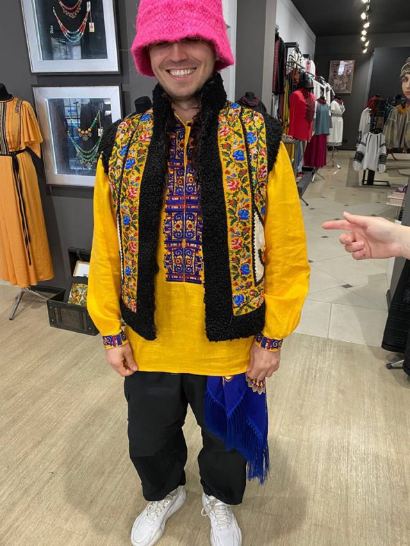 "Ось такий запасний образ ми підготували для Олега й він навіть поїхав із ним на Євробачення-2022! Цей образ імпонував не тільки нам, але й Олегу, але продюсери й постановники номера його не використали. Їм, звісно, видніше! Але цікаво було б почути й ваші враження! Образ пропонували в синьо-жовтих кольорах. Автентичний святковий чоловічий кептар початку XX століття з Буковини (Чернівецька область. - Gazeta.ua) пишно й густо розшитий бісером із приватної колекції Роксоляна Шимчук. Сорочка - сучасна. Стилізація української вишиванки", - написала Роксоляна Шимчук.