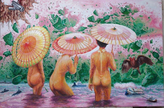 "Це імітація мозаїки. Я наношу товстий шар фарби. Потім роблю фактуру. Беру біле полотно, під яким уже є малюнок і "розкреслюю" його на шматки, як в мозаїці. На кожен з цих шматочків кладу мазки фарб. Це нагадує дитячу розмальовку. Інколи прошу позувати для картин знайомих. Інколи фотографую їх, а потім переношу зображення на полотно", - пояснює художник.
