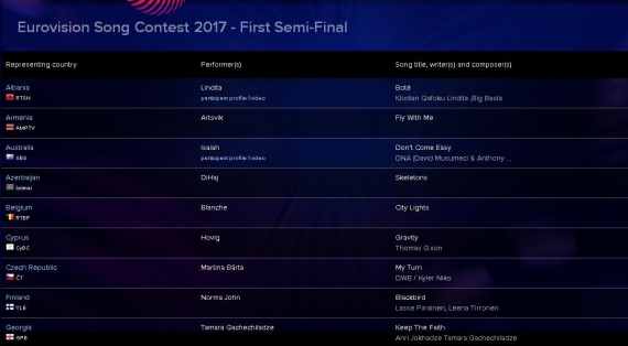 Можна дізнатися в якому півфіналі виступить конкурсант. А також ім'я учасника та назву композиції. Всього у Євробаченні-2017 візьмуть участь 43 країни.