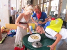 У лівій руці несе білий пакет з каструлею. У ній вареники, яких наліпила його дівчина Марія. Миску ставлять на зелений пластиковий стіл з табличкою "Прес-центр". Двоє жінок чистять огірки-насінники. За 12 хв. миска вареників з картоплею порожніє.