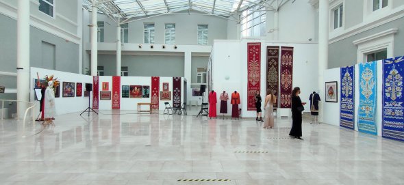 В атріумі музею показують сучасне переосмислення давньої вишивки. Дизайнерське вбрання, картини та рушники.