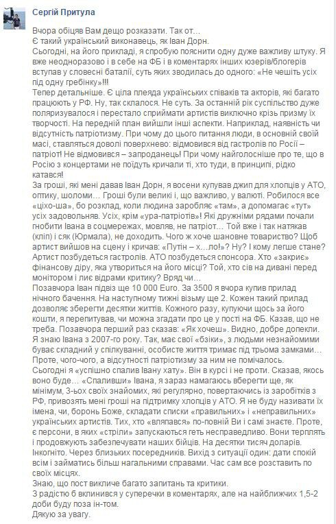"За гроші, які мені давав Іван Дорн, я восени купував джип для хлопців в АТО, оптику, шоломи. Гроші великі і, що важливо, у валюті. Робилося все "тихо". Тому що ситуація, коли людина заробляє "там", а допомагає "тут", усіх задовольняла", - написав тоді Притула. Нині посилання на допис неможливе. Лишився лише скрін.