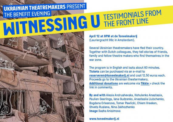 12 квітня о 20:00 в амстердамському театрі De Toneelmakerij відбудеться прем'єра вистави про трагічні історії війни в Україні - Witnessing U. (свідчення про тебе. - Gazeta.ua). Виставу створили спільно із запорізьким муніципальним театром-лабораторією VIE. Режисерками стали дві українки Яша Гудзенко й Богдана Орлеанова.