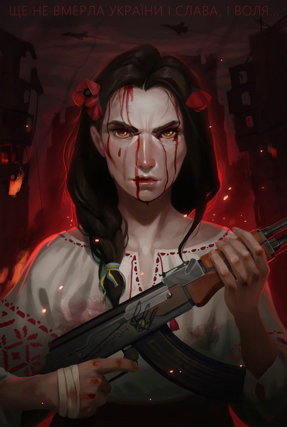 Найбільшої популярності в мережі набула робота Марії із дівчиною в українському вбранні, яка кричить і плаче. Українка сидить серед трупів, які вкривають землю. Картину Марія створила в пам'ять про закатованих безневинних жертв у Бучі, Ірпені, Гостомелі, Маріуполі.