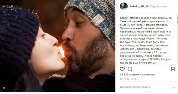 "3 грудня 2007 року ми зі Сніжкою вперше поцілувалися. Це було 10 років тому. Я пам'ятаю цей день. Він дуже важливий для мене. І був переломним моментом у моєму житті, в нашому житті. Якщо б не цей день або якщо б у ньому тоді пішло щось не так, то "сьогодні" могло не бути. Чи могло бути, але, безумовно, не такими барвистим і яскравим, як зараз. Я розповідав про цей день у 15 містах України, зі сцени, перед піснею "Скарб", в турі "15ROKIB". Але для тих, хто не був, я з величезним задоволенням розкажу її ще раз", - написав артист.