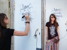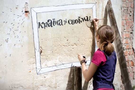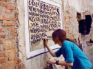 "Взяли з собою кілька тонких та два товстих пензлів, - каже Віталіна. – Покрили лущену цегляну стіну клеєм ПВА, розбавленим водою у співвідношенні 3:1. Літери малювали тонким пензлем. Не використовували якогось конкретного шрифту – просто імпровізували".