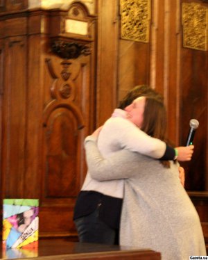 Але Наталя є. Вона підіймається зі свого додаткового доставленого під стіною крісла. Хтось із присутніх схоплюється на ноги, аплодує, хтось, не стримуючи сліз, плескає з місця. Авторка і героїня обіймаються. Підіймаються усі присутні, зала наповнюється нестримними оплесками. Не стримує сліз і Оксана Забужко.