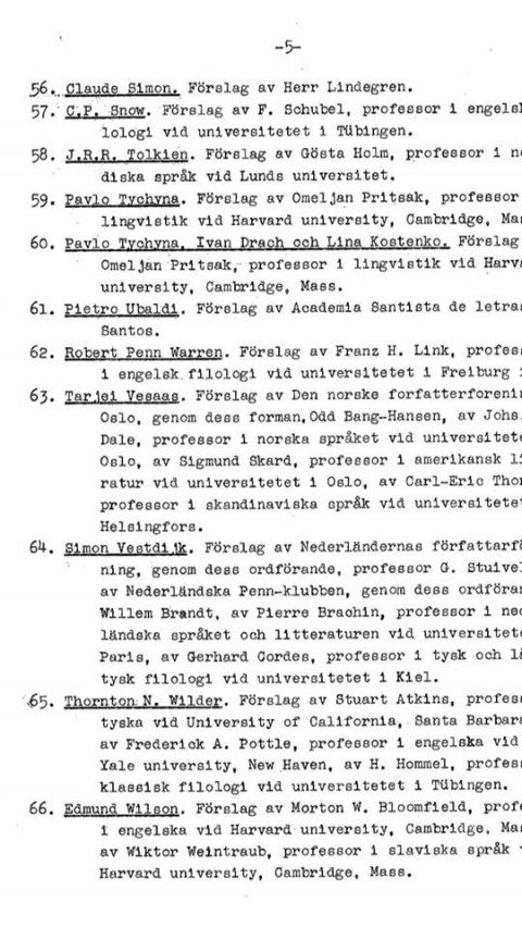 Шведська академія наук опублікувала архівний документ з іменами письменників, яких висували на отримання Нобелівської премії в галузі літератури 1967 року. Списки претендентів тримають в секреті протягом 50 років.