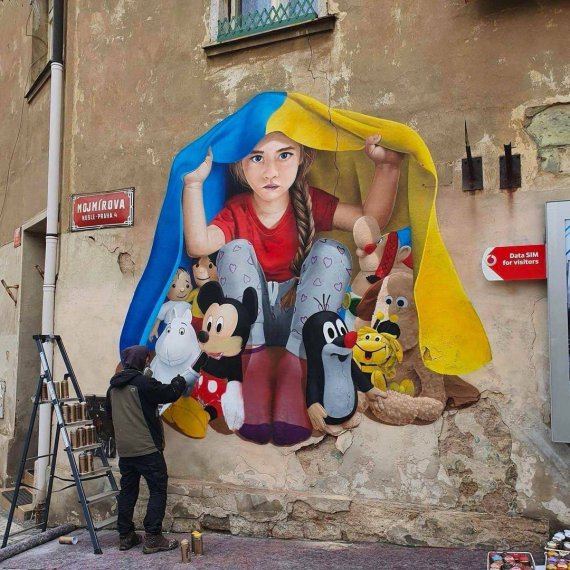 У чеській Празі також у березні відкрили символічний мурал. На ньому - українська дівчинка намагається зберегти світ, представлений у вигляді героїв мультфільмів. Накриває їх синьо-жовтим прапором.