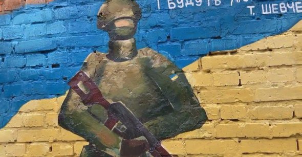 На початку квітня на столичній Оболоні з'явився стінопис художника-мураліста Саші Корбана. Зобразив воїна ЗСУ, який зшиває дві частини українського прапора.