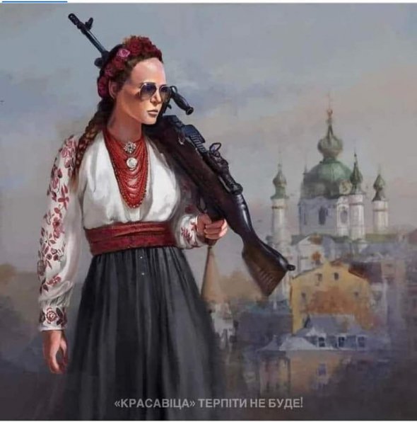 "На муралі зображена Україна в образі жінки - сильна й незалежна. Готова дати відсіч. Робота називається "Красавіца терпіти не буде" - це відповідь на відому фразу фашиста путіна "нравіцца не нравіцца - терпі, моя красавіца", - пояснив художник.