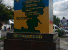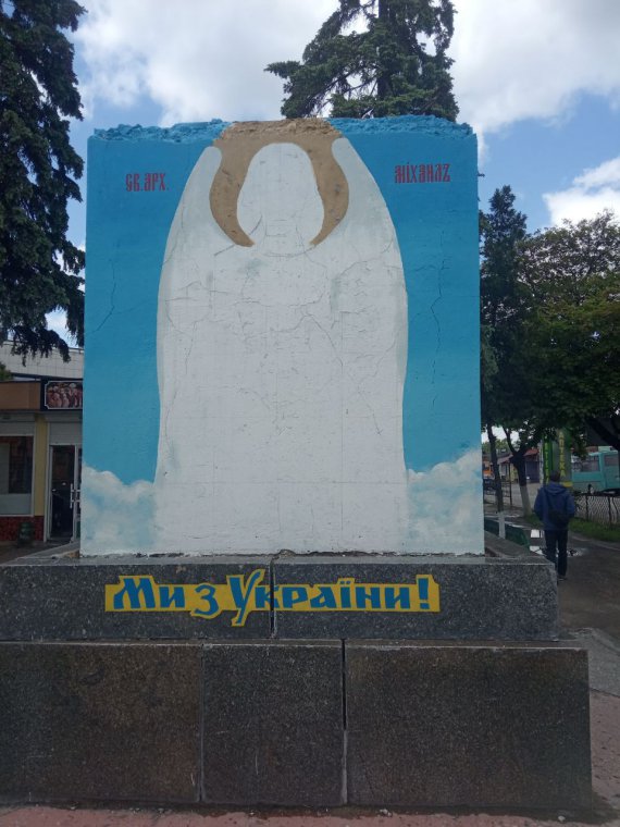 На фронтальній частині постаменту створюють графіті із зображенням архангела Михаїла. Поки що намалювали лише обрис, німб і підпис.