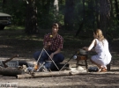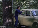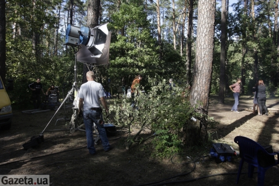 На галявині серед лісу встановили намет і розвели багаття. Знімальний майданчик освітлюють потужні прожектори. Неподалік стоїть "Москвич" кремового кольору.