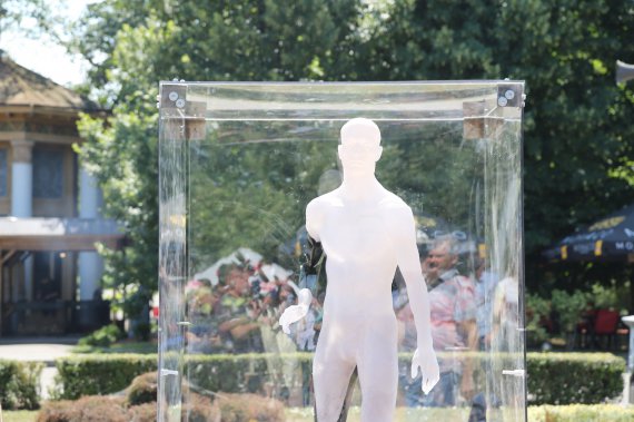 У київському "Експоцентрі" на центральній алеї встановили скульптуру "Трансформація". Це постать людини, яка "виходить" з прозорого кубу. Зроблена із полімерів, з двох боків вона має сенсори, що реагують на доторк до руки. Створювала команда з 20 людей, яку очолив скульптор Кирило Гузенко.