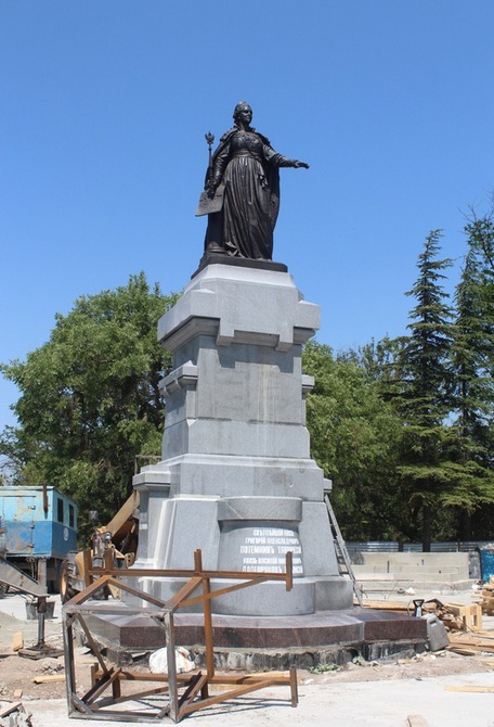 Поки що Катерина стоїть за великим парканом. Відкриття пам'ятника планується в кінці червня. Розташують у Центральному парку культури і відпочинку. Він там стояв з 1890 року. Бронзова імператриця у правій руці тримала скіпетр і розгорнуту карту Криму, ліва була скерований до міста. Монумент простояв до 1921 року. Навколо підніжжя були скульптури державних діячів катерининської епохи, які брали участь у приєднанні Криму до Росії.