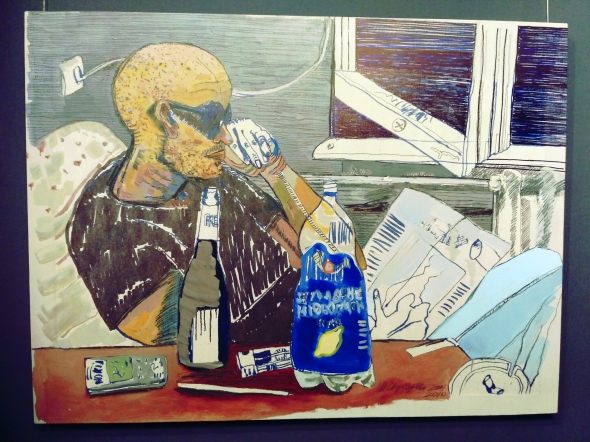 Марина Скугарєва написала портрет чоловіка, коли він відпочивав на кухні. На ньому Тістол сидить, читаючи газети. На столі — пляшки і цигарки.