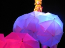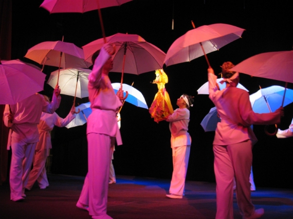 Декорацій на сцені не було. "Замість них використали 15 білих парасоль від дощу. Думаю, це універсальна декорація, Наприклад, актори збіглися докупи, виставили їх як щит, і це вже домівка для мишей. Або поставили трикутником одна над одною і маємо гору Фудзі. З них же робили хмари, вітер та Велику Китайську стіну, - поділилася враженнями вчителька молодших класів однієї з полтавських шкіл Неля Іванівна. Привела на виставу другокласників. - Також на дітей справила враження гра світла й тіні. Вони створювали казкову атмосферу. А музика, одяг акторів та ляльок передавав колорит Японії".