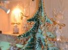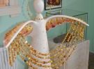 Вертеп стоїть на окремому подіумі біля стіни. Його підсвічують гірляндою з жовтих світлодіодів. Фігурки зроблені з кераміки і прикрашені бурштином різних відтінків. Поруч – гаптовані камінням янголи на серветках.