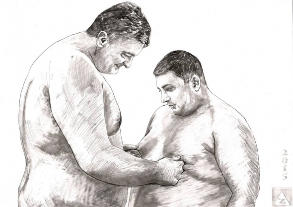 "Я намалював цю карикатуру одразу після виступу Гройсмана щодо внесення антидискримінаційних поправок до трудового законодавства. Тоді він кричав, що в Україні ніколи не буде одностатевих шлюбів. Хоча жодного слова в поправках про шлюби не було. Більшість моїх художніх робіт - це люди, люди без одягу. Після цього малюнка було багато запитів у друзі від усяких придурків з так званих ЛНР і ДНР. Вони чомусь вирішили, що я страшенно ненавиджу владу і пристрасний прихильник Новоросії. Малюнок використовують багато ресурсів із дуже сумнівною репутацією. Ще до нього полюбляють дописувати діалоги та давати назви".