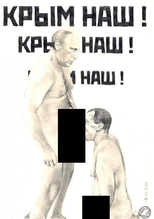 "Це найперша робота зі своєрідного триптиху "Крим наш". Зроблена весною 2014-го. Тема - окупація Криму. Намалював Путіна з Медведєвим. Хотів сказати, що для них це просто ігри. Це те, від чого вони отримують задоволення. Завдяки цьому малюнку пройшла перша і найбільша хвиля "видалення з друзів". Тоді багато хто продовжував вірити, що Росія - то наші друзі. Одна жінка з Криму через цю роботу накатала заяву на мене в ФСБ. Писала, що вони мене викрадуть і посадять. Я її просто заблокував і забув. Хоча хотів би зустрітися з Путіним. Але винятково, щоб пристрелити".