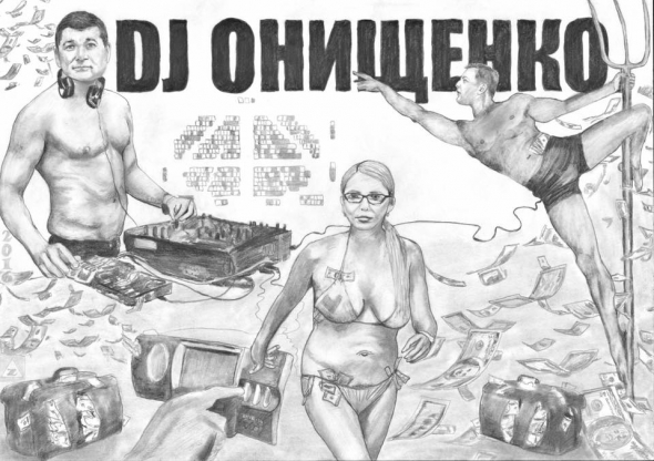 "Тут розкрив тему скандалу з так званими "аудіозаписами Онищенка". Показав ефективність його роботи у Верховній раді. Онищенко втік з України до Британії. Верховна Рада зняла з депутата недоторканність. Його підозрюють в організації схеми з розкрадання коштів під час видобутку й продажу природного газу. Онищенко завдав збитків державі на близько 3 мільярди гривень. Коли малював, було актуально. Зараз про це не згадують. Як і про майже все інше. Деякі наближені до нього були розлючені. Навіть погрожували. Хоча у мене немає мети малювати непристойно".