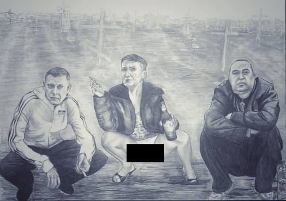 "А так я бачу велику "переговорщицю Надю", тут все алегорично. У грудні вона таємно відвідала Мінськ, де за посередництва ФСБ Росії зустрілася з ватажками ДНР і ЛНР Захарченком і Плотницьким. Досі не розумію, як могла в голову прийти така суперідея зустрічатися з гопниками. Кажуть, що чоловіки тут викликають навіть більше довіри, ніж вона. Але для мене один чорт — що собака, що хорт".