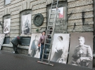 13 фотографій розмістили на двох нижніх поверхах будівлі. За день до відкриття їх привезли на вантажній "газелі". Двоє робітників свердлили отвори у стінах, щоб шурупами закріпити фотографії. "Кріпити фотографії важко, бо вони великі — два метри у висоту. На одну витрачаємо не менше 30 хвилин", - розповів один із робітників.