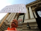 Кілька членів Української республіканської партії підіймають плакат із написом: "Українці, зупинимо омоскалення України".