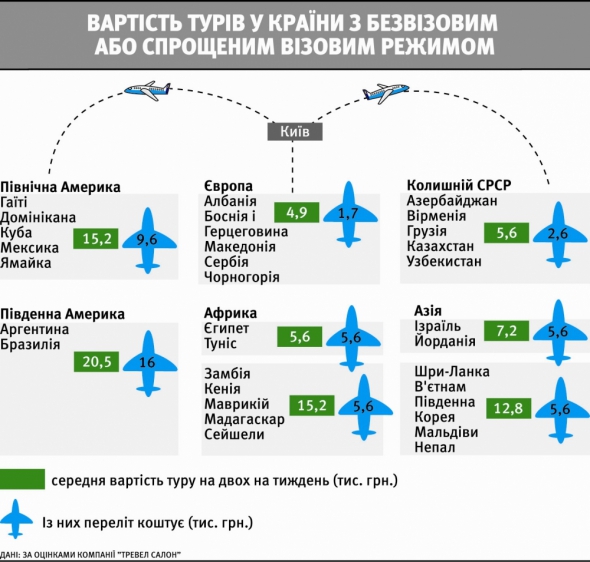 За її словами, у деякі цікаві безвізові країни дуже далеко летіти. Наприклад, щоб дістатися до Бразилії, потрібно провести у літаку 20-22 години. Такі країни як Куба, Домінікана, Мексика досить дешеві. Там є пляжі, клуби, і тихі місця для сімейних пар. Тиждень на двох у кращих п'ятизіркових готелях із харчуванням "олл інклюзів" коштує 700 доларів. Але переліт туди коштує щонайменше 1200 доларів. А от екскурсійна програма і сафарі у Кенії, навпаки, коштує набагато дорожче, ніж переліт.