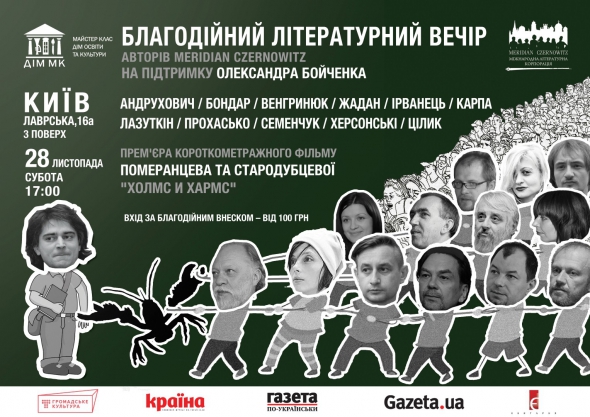 У суботу, 28 листопада о 17:00, у столичному Домі Освіти та Культури "Майстер клас" (вул. Лаврська, 16 А, 3 поверх) відбудеться благодійний літературний вечір авторів Міжнародної літературної корпорації MERIDIAN CZERNOWITZ на підтримку публіциста, літературознавця і перекладача Олександра Бойченка.