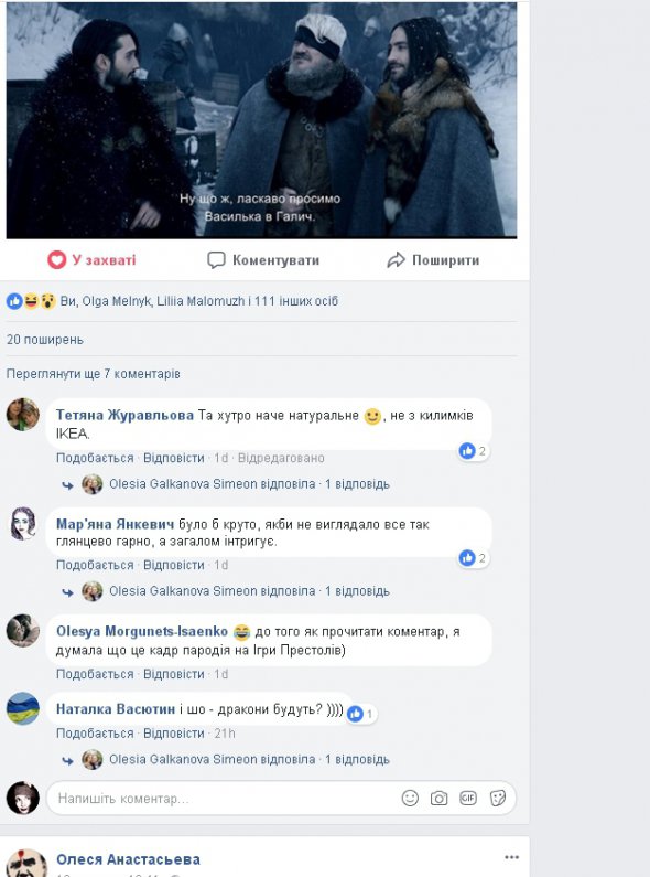 "Блін. Я справді думала, це Гра престолів", - зазначила Olga Melnyk.