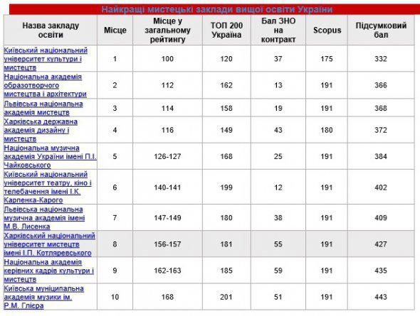 Інформаційний ресурс "Освіта.ua" представив мистецькі виші, які посіли найвищі місця в консолідованому рейтингу вищих навчальних закладів України 2021 року.