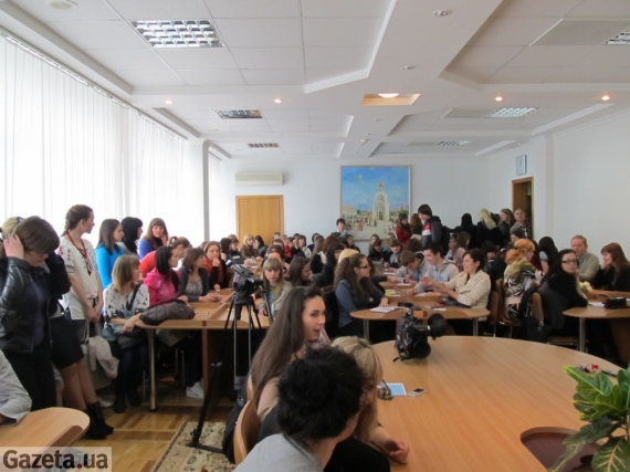 В конференц-залі на другому поверсі університету вже зайняті всі місця, приносять ще стільці. Зібралися студенти-філологи, журналісти, редактори та їхні викладачі.