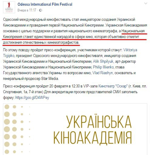 Організатори Одеського кінофестивалю мають намір створити українську кіноакадемію. Одна з її функцій - вручення кінонагороди, на зразок "Оскара" - національної кінопремії. Ініціатори називають майбутню кінопремію "єдиною нагородою в сфері кіно, яка об'єктивно відзначить досягнення вітчизняних кінематографістів".