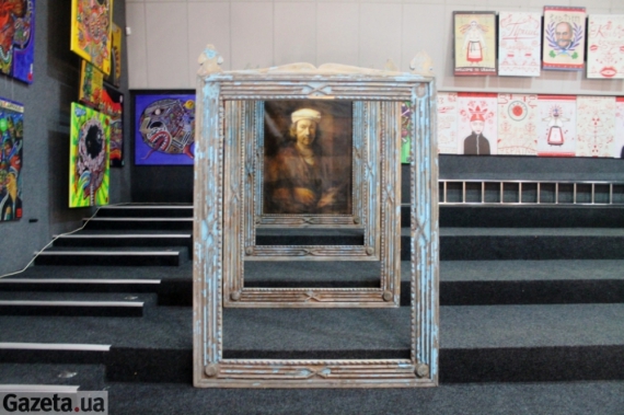 У фойє роботи Дмитра Кришовського – київського графіка родом з Черкащини. Історичних постатей та класиків літератури митець "вдягнув" у спортивні костюми. Серед них Гоголь, Шевченко, Горбачов, Леся Українка, Сталін. Гітлера і Януковича організатори попросили прибрати.
