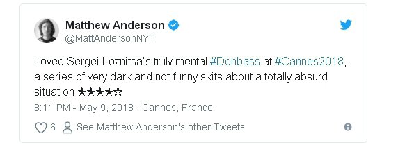 "Рідко доводиться бачити фільм, наповнений такою люттю і відразою, як "Донбас" Сергія Лозниці. Кошмарні замальовки з "Народних республік України" з лінчуванням, солдатами і фейковий новинами. Так, я в захваті", - написав шведський письменник і журналіст Ган Брукс.