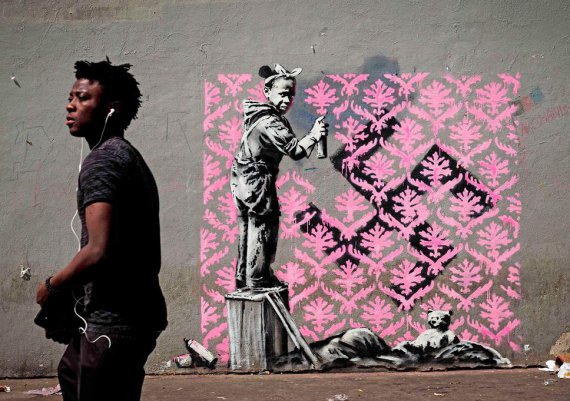 На одному з графіті темношкіра дівчинка замальовує свастику. На іншій роботі чоловік з пилкою в руках простягає кістку собаці. При цьому у тварини немає однієї лапи. На кількох малюнках присутні улюблені персонажі художника - миші.