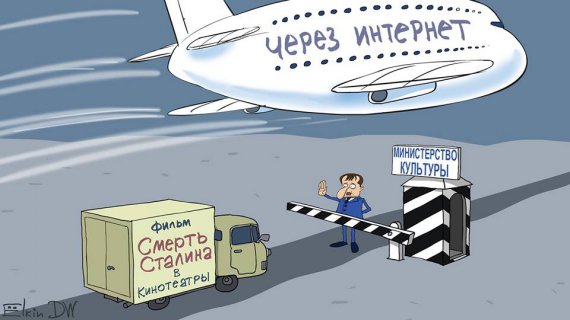 Російського художника Сергія Йолкіна заборона показу фільму "Смерть Сталіна" у Росії надихнула на створення низки влучних карикатур.