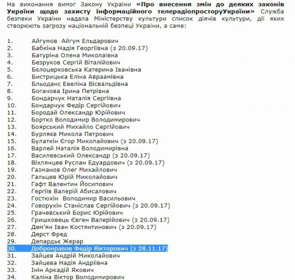 Список таких осіб надає Мінкульту Служба безпеки України на виконання вимог Закону України "Про внесення змін до деяких законів України щодо захисту інформаційного телерадіопростору України".