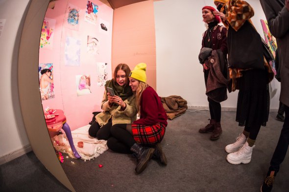 "Жоден колір не викликав стільки опору і гоніння. Асоціюють з інфантильністю та гламуром. Це не завжди так було, - каже кураторка Аніта Немет. - Наприклад, в епоху рококо XVIII століття рожевий з однаковим захватом носили модники обох статей. Однак у 1950-х треба було жінок повернути до кухні, бо завдяки Другій світовій звільнилися від ярма "домашнього вогнища". Це стало можливим за допомогою "міфу про красу". Його втіленням став ідеальний і пластиковий колір одягу, будинків, машин, предметів побуту. Рожеві речі були на 7 відсотків дорожчі. Це явище навіть отримало назву Pink tax. Минулої виставки мали роботу, яка так і називалась: Capitalistic Millennial Pink.