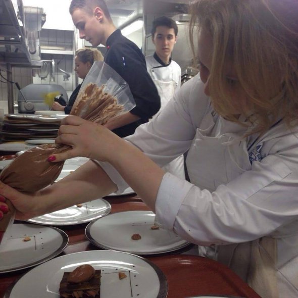"Усі страви, що готували, залишалися нам. Ділилися ними з іншими. На одному занятті кожен робив чотири або шість порцій. За день могли наготувати страв на 8 людей. Самим стільки з'їсти важко, - розповідає Оксана Дубчак. - За приготуванням спостерігав шеф-кухар. У процесі він оцінював форму, чистоту робочого місця. Куштував готові страви. Також знімали бали за запізнення . Якщо спізнився на екзамен на 5 хвилин, страву можна вже не подавати. Сам іспит проводять всліпу. Приходять шеф-кухарі з відомих французьких ресторанів. Ми в цей час готуємо на кухні. Готові страви їм виносять під номерками. Ніхто не знав, чию роботу оцінював".