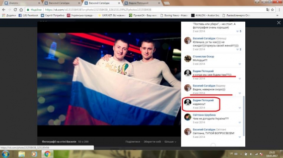 "Вони лайкають світлини зрадників з російським триколором і запитують, коли вони вже будуть частиною Росії. Для прикладу: офіцер МВС із Одеси Вадим Потоцький під світлиною друга з російським триколором запитує: "Когда мы уже будем там? (в Росіїї - Gazeta.ua)? Надеюсь - скоро".