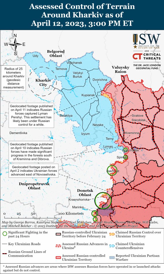 Ще один російський "воєнкор" стверджував, що зараз російські війська контролюють 80% Бахмута, зокрема всі центральні адміністративні будівлі. Згідно з контрольною оцінкою місцевості ISW від 11 квітня, візуально підтверджено, що російські війська контролюють щонайменше 76,5% міста.