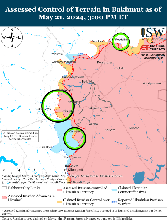 Війська РФ тим часом незначно просунулися на південь від Сіверська (на північний схід від Бахмута). Водночас у ISW не спостерігали візуальних доказів, які б підтверджували ці заяви. Невідомі підрозділи ПДВ Росії продовжують атакувати на Сіверському напрямку.