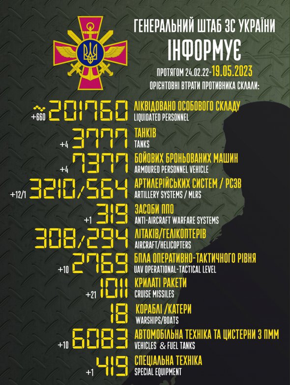 Загальні бойові втрати Росії на ранок п'ятниці, 19 травня, становлять 201 760 окупантів.